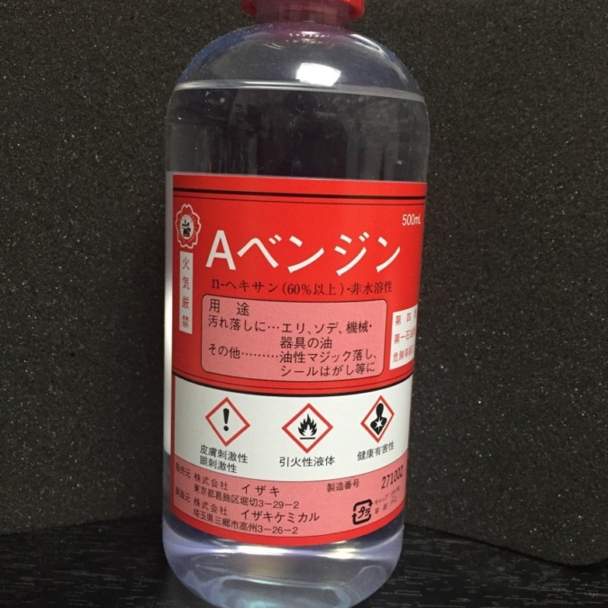 ベンジンは薬局で普通に購入出来て、画像のサイズで大体500円くらいです。